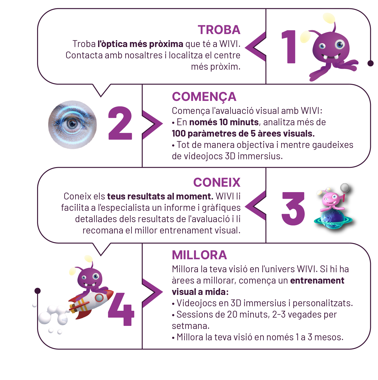 WIVI avalua la teva eficiència visual en 10 minuts i t'ajuda a millorar-la en menys de 3 mesos amb entrenament visual a través de videojocs 3D immersius i personalitzats.